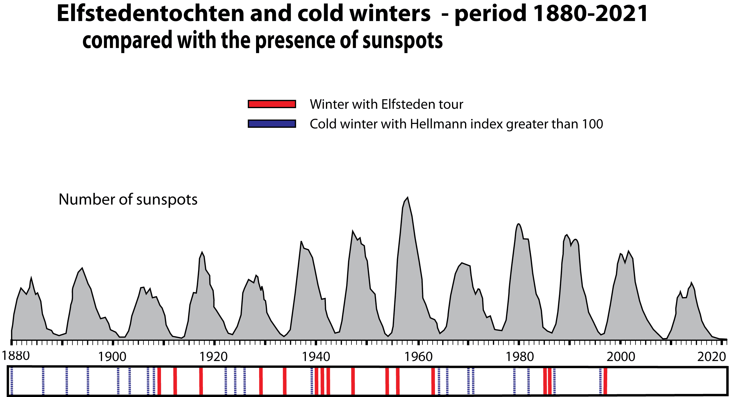 Good skating winters and sunspots are plotted on a figure It is clear that periods of absence of sunspots have many severe winters compared to winters with many spots, but there are several exceptions. In particular the winter of 1976 was very disappointing, because there was no severe winter. After that there were elfstedentochts in 1985, 1986 and 1997 at sunspot minima.