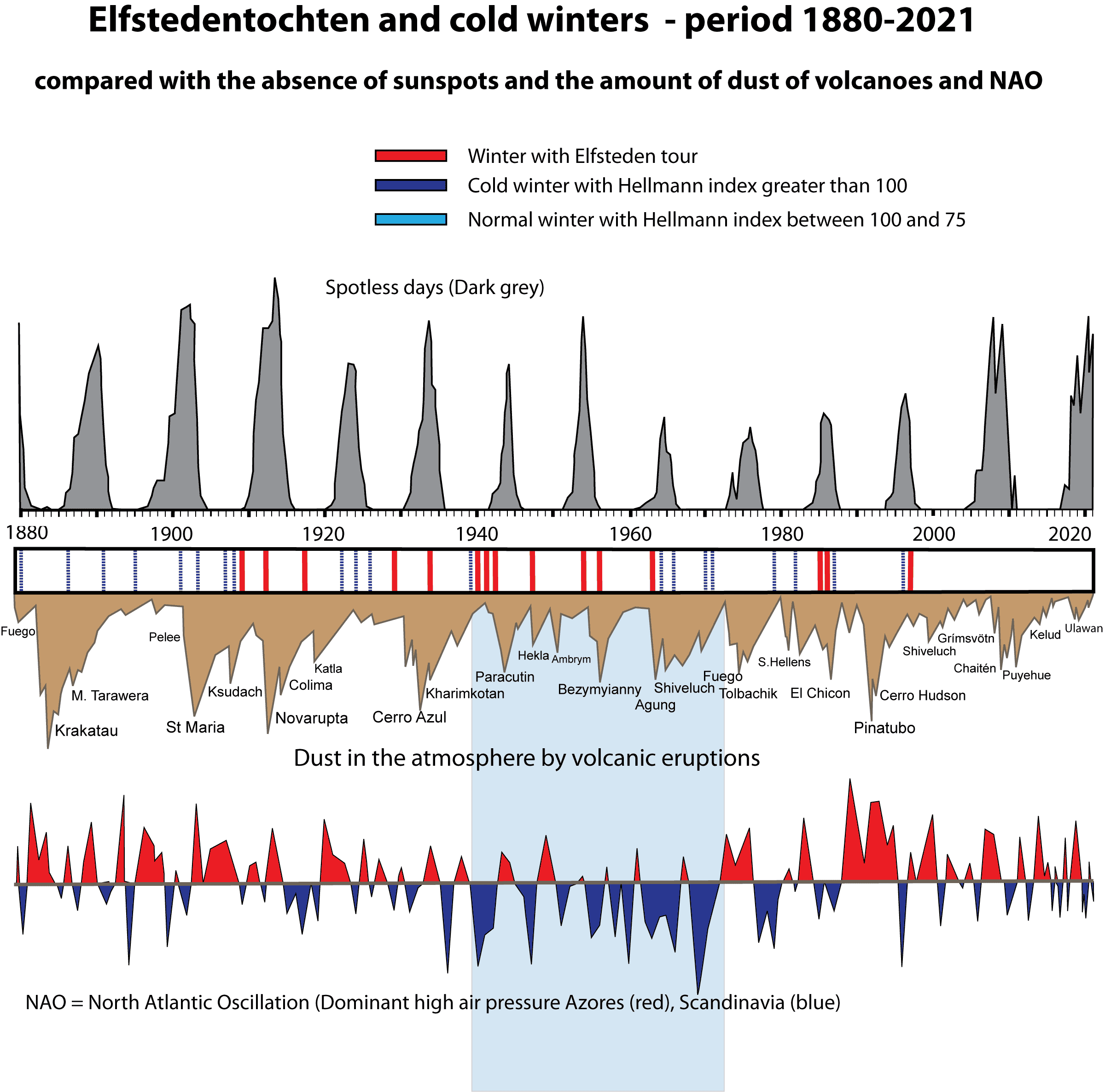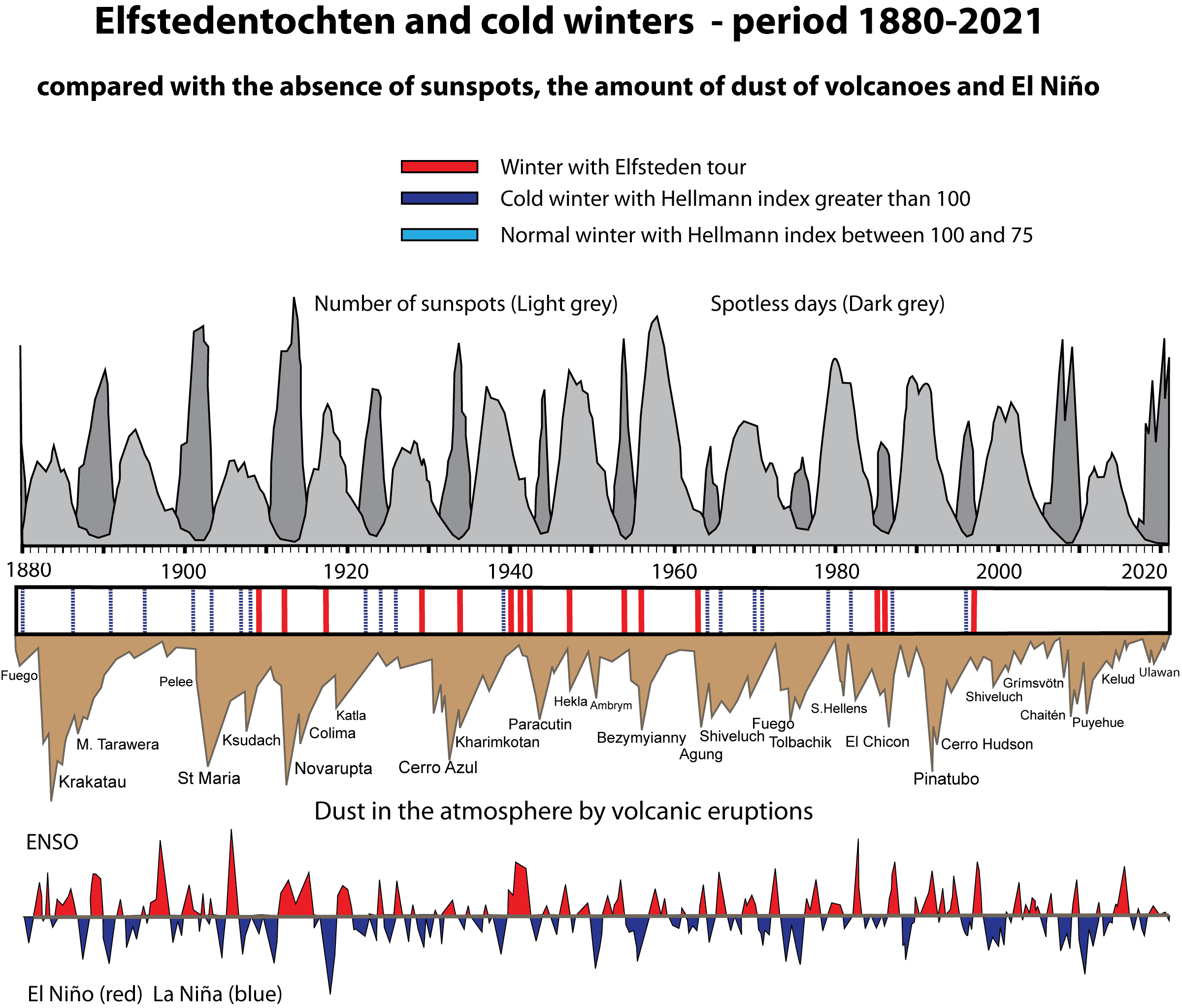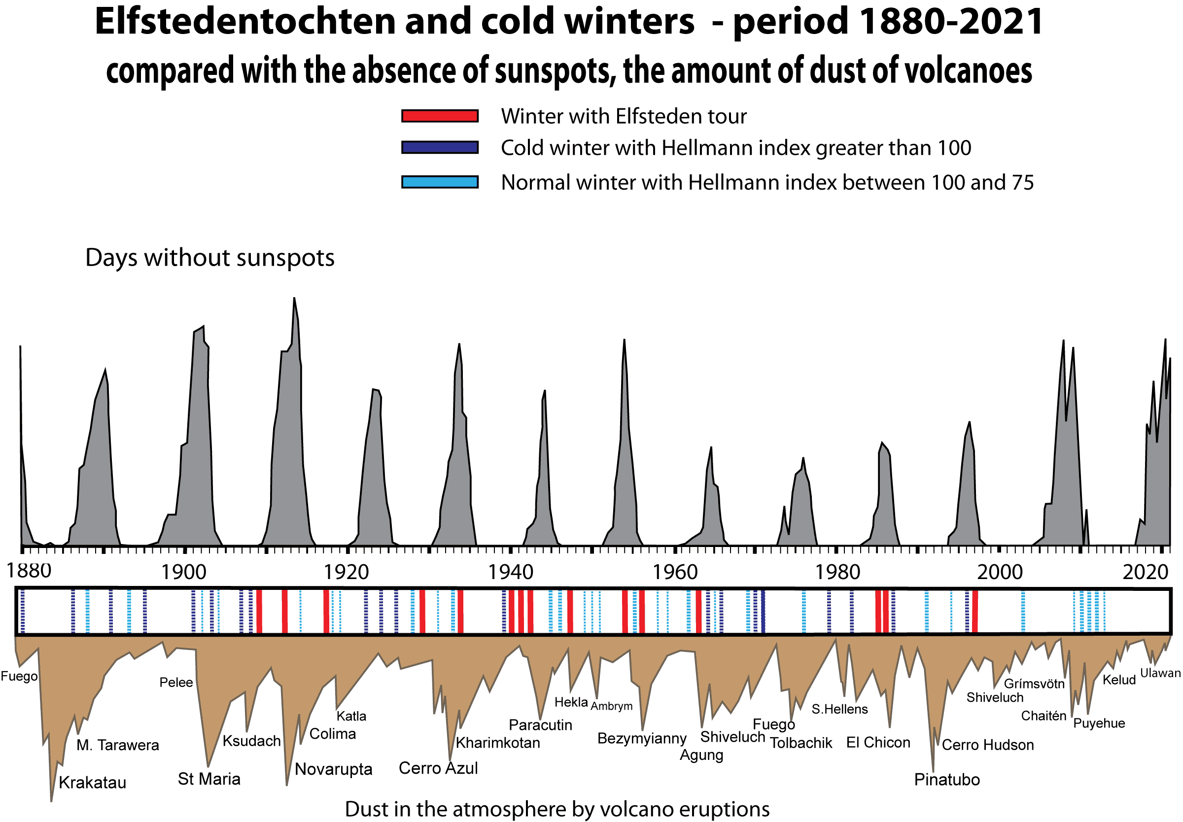 If we compare the Dutch cold winters with large eruptions of volcanoes (Krakatau, which showed a large eruption in August 1883, caused at least two bad summers in the Netherlands), the relationship is not really clear. Volcanoes may explain the winters of 1903 and 1963. I have fond memories of skating in the early 1990s, possibly caused by the impressive eruption of Pinatubo in the Philippines.