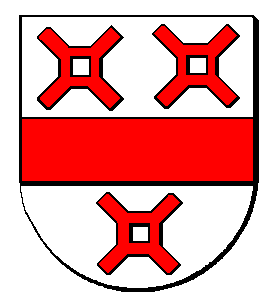 Wapen: In zilver een rode dwarsbalk, vergezeld van drie rode molenijzers (2-1).